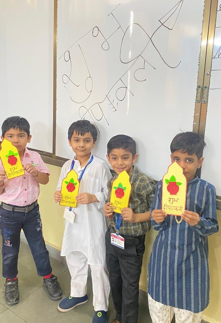 The Pre-Primary students brought cheer to the occasion, dressed in colourful traditional attire, sharing delightful rhymes, and receiving Diwali-themed takeaways. Across the school, students participated enthusiastically in various House activities, including a Rangoli competition, festive festoon-making, diya decoration, and an impressive Ramayana enactment that captured the spirit of the epic.